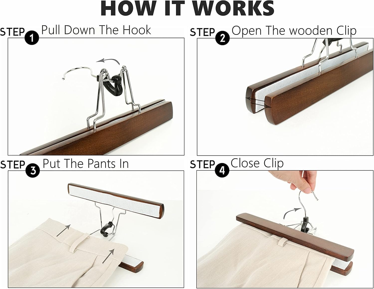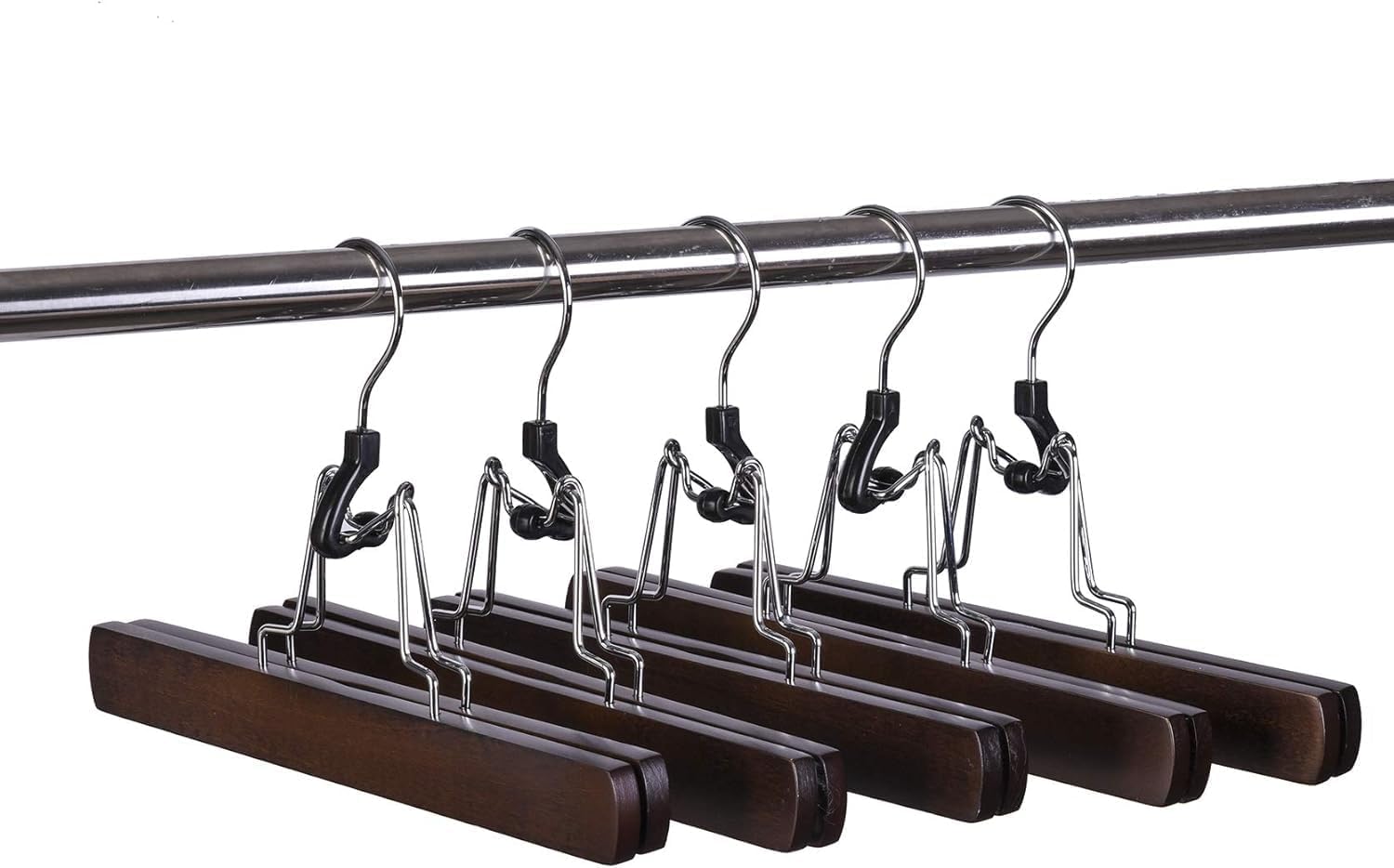 Two smooth wooden bars lined with plush, non-slip felt hold garments firmly in place. Sturdy chrome clips prevent slipping, keeping skirts, pants, and delicate fabrics safe from falls or creases.Versatile Storage