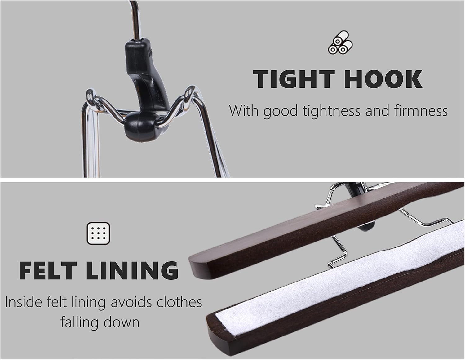Elevate your wardrobe with our premium solid wood hangers, coated in a high-grade lacquer that preserves their rich finish and adds a touch of elegance to your closet for years to come.Secure Non-Slip Grip